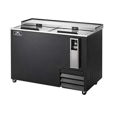 Cook with premium refrigeration using the Arctic Air AUB50R Bottle Cooler. This commercial-grade cooler is designed to meet the needs of busy restaurants, offering a spacious 49-1/2" width and a capacity of 16.5/24 cases (12 oz. bottles/cans). The side-mounted self-contained refrigeration system ensures efficient cooling, while the electronic thermostat with a digital LED display allows for precise temperature control. The cooler features two stainless steel sliding lids with locks, providing easy access and security for your beverages. With interior LED lighting, you can easily locate and retrieve your drinks, even in low-light conditions. The black powder-coated steel front and sides give the cooler a sleek and professional appearance, while the stainless steel interior ensures durability and easy cleaning. Equipped with four 3-1/2" casters (2 locking), this cooler can be easily moved and positioned wherever it's needed. Trust Arctic Air for reliable refrigeration solutions in your commercial restaurant.