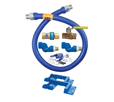 Unlock potential with powerful gas cooking and heating using the Dormont Manufacturing 1650KIT2S48PS Gas Connector Hose Kit. This kit is designed specifically for commercial restaurant use, providing a reliable and safe connection for gas-powered appliances. The kit includes a 48" long hose covered with a stainless steel braid and coated with blue antimicrobial PVC, ensuring durability and cleanliness. With the included SnapFast QD and Swivel MAX connectors, installation is quick and easy. The full port valve allows for precise control of gas flow, while the pair of Safety Set with hardware mounting options ensures secure installation. Backed by a limited lifetime warranty, this gas connector hose kit from Dormont Manufacturing is a trusted choice for commercial kitchens. Upgrade your restaurant's gas connections with this high-quality kit and experience the benefits of enhanced safety and efficiency.