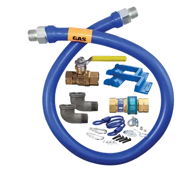 Introducing the Dormont Manufacturing 1650KIT36PS Gas Connector Hose Kit an innovative tool for efficient gas cooking and heating in commercial restaurant settings. This kit includes a 36" long, 1/2" inside diameter Dormont Blue Hose covered with a stainless steel braid and coated with blue antimicrobial PVC. It also comes with a SnapFast QD for easy installation, a full port valve for optimal gas flow control, and two 90-degree elbows for flexible positioning. The kit even includes a pair of Safety Set with hardware mounting options for added security. With its limited lifetime warranty, you can trust the durability and reliability of this gas connector hose kit. Designed by Dormont Manufacturing, a trusted vendor in the industry, this kit ensures safe and efficient gas connections, making it a must-have for any commercial restaurant looking to enhance their cooking and heating operations.