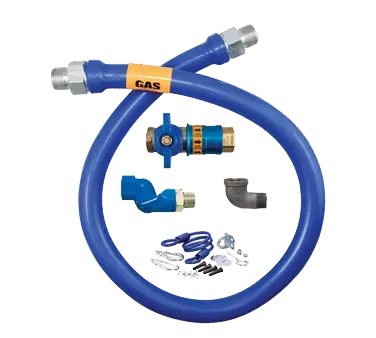 Transform elements with essential gas cooking and heating using the Dormont Manufacturing, 1650KITCFS60 Gas Connector Hose Kit. This kit includes a 60" long, 1/2" inside diameter hose covered with a stainless steel braid and coated with blue antimicrobial PVC. It also comes with a Safety Quik QDV and a Swivel MAX for added convenience and safety. The kit is designed for commercial restaurant use, with a minimum flow capacity of 56,000 BTU/hr. The hose is moveable, allowing for flexibility in positioning gas cooking and heating equipment. Additionally, the kit includes a coiled restraining cable with hardware to ensure secure installation. With a limited lifetime warranty, you can trust the durability and reliability of this gas connector hose kit from Dormont Manufacturing. Upgrade your restaurant's gas connections with this high-quality kit.