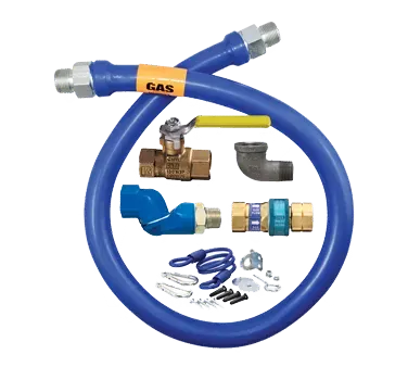 Unleash efficiency in safe appliance positioning with the Dormont Manufacturing, 1650KITS24, Gas Connector Hose Kit. Designed specifically for commercial restaurant use, this kit ensures a secure and reliable connection between your gas appliances and the gas supply. The 1/2" inside diameter hose is covered with a stainless steel braid and coated with blue antimicrobial PVC, providing durability and protection against bacteria growth. The kit includes a SnapFast QD, a Swivel MAX, a full port valve, and an elbow, allowing for easy installation and flexibility in appliance placement. With a minimum flow capacity of 81000 BTU/hr, this kit can handle the demands of high-powered commercial appliances. The coiled restraining cable with hardware adds an extra layer of safety, preventing accidental disconnection. Backed by a limited lifetime warranty, the Dormont Manufacturing Gas Connector Hose Kit is a reliable and essential component for any commercial restaurant.