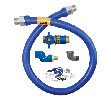 Ignite inspiration with a remarkable addition for water access and use. Introducing the Dormont Manufacturing Gas Connector Hose Kit, model number 1675KITCFS24. Designed specifically for commercial restaurant use, this kit includes a 24" long, 3/4" inside diameter hose covered with a stainless steel braid and coated with blue antimicrobial PVC. With a minimum flow capacity of 216,000 BTU/hr, this kit ensures efficient gas supply to your restaurant equipment. Safety is a top priority, which is why the kit includes a Safety Quik QDV and a Swivel MAX for secure connections. The coiled restraining cable with hardware adds an extra layer of protection. Backed by a limited lifetime warranty, this kit from Dormont Manufacturing provides peace of mind and reliability. Upgrade your restaurant's gas connection system with the Dormont Manufacturing Gas Connector Hose Kit.