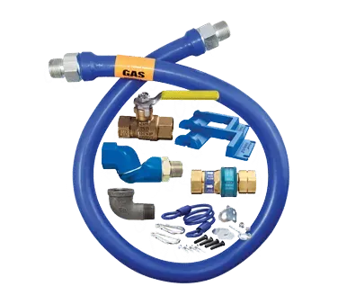 Unlock potential with powerful gas cooking and heating using the Dormont Manufacturing 1675KITS48PS Gas Connector Hose Kit. Designed specifically for commercial restaurant use, this kit includes everything you need to ensure safe and efficient gas connections. The 48" long hose is covered with a stainless steel braid and coated with blue antimicrobial PVC, providing durability and protection against bacteria growth. The kit also includes a SnapFast QD, Swivel MAX, full port valve, elbow, SnapN Go, and a pair of Safety Set with hardware mounting options. With a limited lifetime warranty, you can trust in the quality and reliability of this kit. Whether you're setting up a new restaurant or upgrading your existing gas connections, the Dormont Manufacturing 1675KITS48PS Gas Connector Hose Kit is the perfect choice for professional-grade performance and peace of mind.