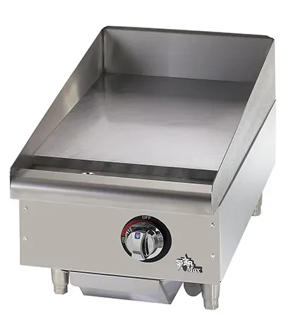 Star-Max®manual gas griddles are a perfect match for the budget minded operator. For breakfast, lunch or dinner, the Star-Max manual control griddles out-perform the competition. Star-Max® griddles feature 1” thick polished steel griddle plate and are available in 15”, 24” 36” and 48” widths. 28,300 BTU aluminized burner every 12” of width controlled by a modulating thermostatic, 3/4” N.P.T. male gas connection with convertible pressure regulator, and 4” adjustable legs. Griddles operate on Natural or Propane gas.