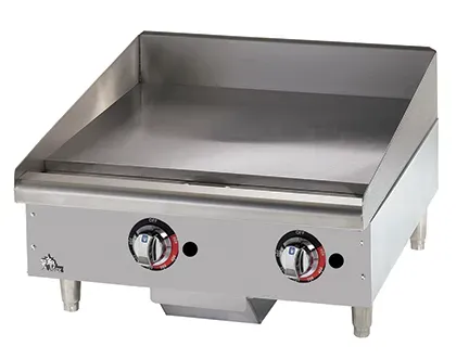 Star-Max®manual gas griddles are a perfect match for the budget minded operator. For breakfast, lunch or dinner, the Star-Max manual control griddles out-perform the competition. Star-Max® griddles feature 1” thick polished steel griddle plate and are available in 15”, 24” 36” and 48” widths. 28,300 BTU aluminized burner every 12” of width controlled by a modulating thermostatic, 3/4” N.P.T. male gas connection with convertible pressure regulator, and 4” adjustable legs. Griddles operate on Natural or Propane gas.