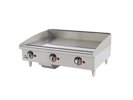Star-Max®manual gas griddles are a perfect match for the budget minded operator. For breakfast, lunch or dinner, the Star-Max manual control griddles out-perform the competition. Star-Max® griddles feature 1” thick polished steel griddle plate and are available in 15”, 24” 36” and 48” widths. 28,300 BTU aluminized burner every 12” of width controlled by a modulating thermostatic, 3/4” N.P.T. male gas connection with convertible pressure regulator, and 4” adjustable legs. Griddles operate on Natural or Propane gas.