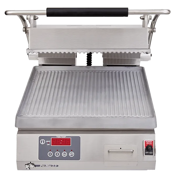 The Star Pro-Max 2.0® sandwich grills are designed to cook wraps, sandwiches, chicken breasts, hamburgers, and much more. The design is compact and portable providing flexibility. These grills can come with smooth, grooved, or combination surfaces, made of aluminum or iron. The available electronic temperature control and timer are industry leading options.