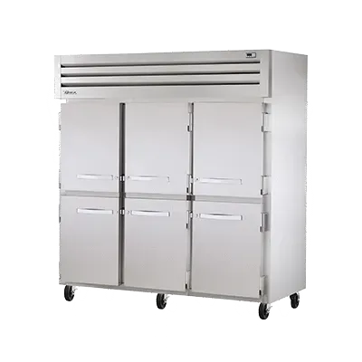 Achieve kitchen supremacy with the True Manufacturing STG3R-6HS Refrigerator, Reach-In. This top-of-the-line refrigerator is designed to meet the demanding needs of commercial restaurants. With its three-section design and six stainless steel half doors, this refrigerator offers ample storage space while ensuring easy access to your ingredients. The cam-lift hinges and locks on the doors provide added security and durability. The digital temperature control allows you to easily adjust and monitor the temperature to keep your food fresh and safe. The nine gray shelves offer plenty of room for organizing your items, while the LED interior lights provide excellent visibility. Made in the USA, this refrigerator features a stainless steel front, aluminum sides, and an aluminum interior, ensuring its longevity in a busy kitchen environment. Equipped with 5" castors and a 1/2 HP motor, this refrigerator is easy to move and provides reliable performance. Upgrade your kitchen with the True Manufacturing STG3R-6HS Refrigerator, Reach-In.