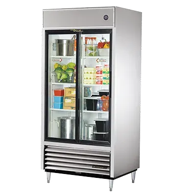 Introducing the True Manufacturing TSD-33G-HC-LD Refrigerator, Reach-In - the perfect companion for culinary wonders in your commercial restaurant. This top-of-the-line refrigerator boasts a stainless steel front and aluminum sides, ensuring durability and a sleek appearance that will impress your customers. With two glass sliding doors, you can easily access your ingredients while keeping them at the optimal temperature. The clear coated aluminum interior, along with six PVC coated wire shelves, provides ample space for all your perishables. LED interior lighting illuminates the contents, making it easy to find what you need. The 6" legs offer stability and convenience during cleaning. Made in the USA by True Manufacturing, this refrigerator is not only reliable but also energy-efficient, thanks to the R290 Hydrocarbon refrigerant. With its 1/2 HP motor and 115v/60/1-ph power supply, this refrigerator is ready to handle the demands of a busy commercial kitchen. Upgrade your restaurant with the True Manufacturing TSD-33G-HC-LD Refrigerator, Reach-In and experience the difference in quality and performance.