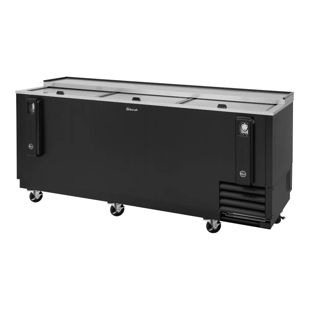 Unleash your kitchen's potential with the Turbo Air TBC-80SB-N Bottle Cooler. This sleek and efficient cooler is designed to meet the demands of a busy commercial restaurant. With a spacious 80.50"W interior and 22.6 cu.ft. capacity, it can hold a large quantity of bottles, keeping them perfectly chilled and ready for serving. The self-cleaning condenser ensures optimal performance and reduces maintenance needs, while the five adjustable dividers allow for easy organization and customization. The built-on removable bottle cap opener and catcher add convenience and efficiency to your beverage service. The three sliding lids provide easy access to the contents, while the stainless steel countertop and lid offer durability and a professional look. The black laminated exterior and stainless steel interior walls and floor are not only stylish but also easy to clean. With a side mount compressor and front breathing design, this bottle cooler can be seamlessly integrated into your kitchen layout. The Turbo Air TBC-80SB-N Bottle Cooler is equipped with R290 Hydrocarbon refrigerant, ensuring energy efficiency and environmental friendliness. With its 1/3 HP motor and 115v/60/1-ph power supply, this cooler is both powerful and energy-efficient. Whether you're running a bar, restaurant, or catering service, the Turbo Air TBC-80SB-N Bottle Cooler is the perfect addition to your commercial kitchen.