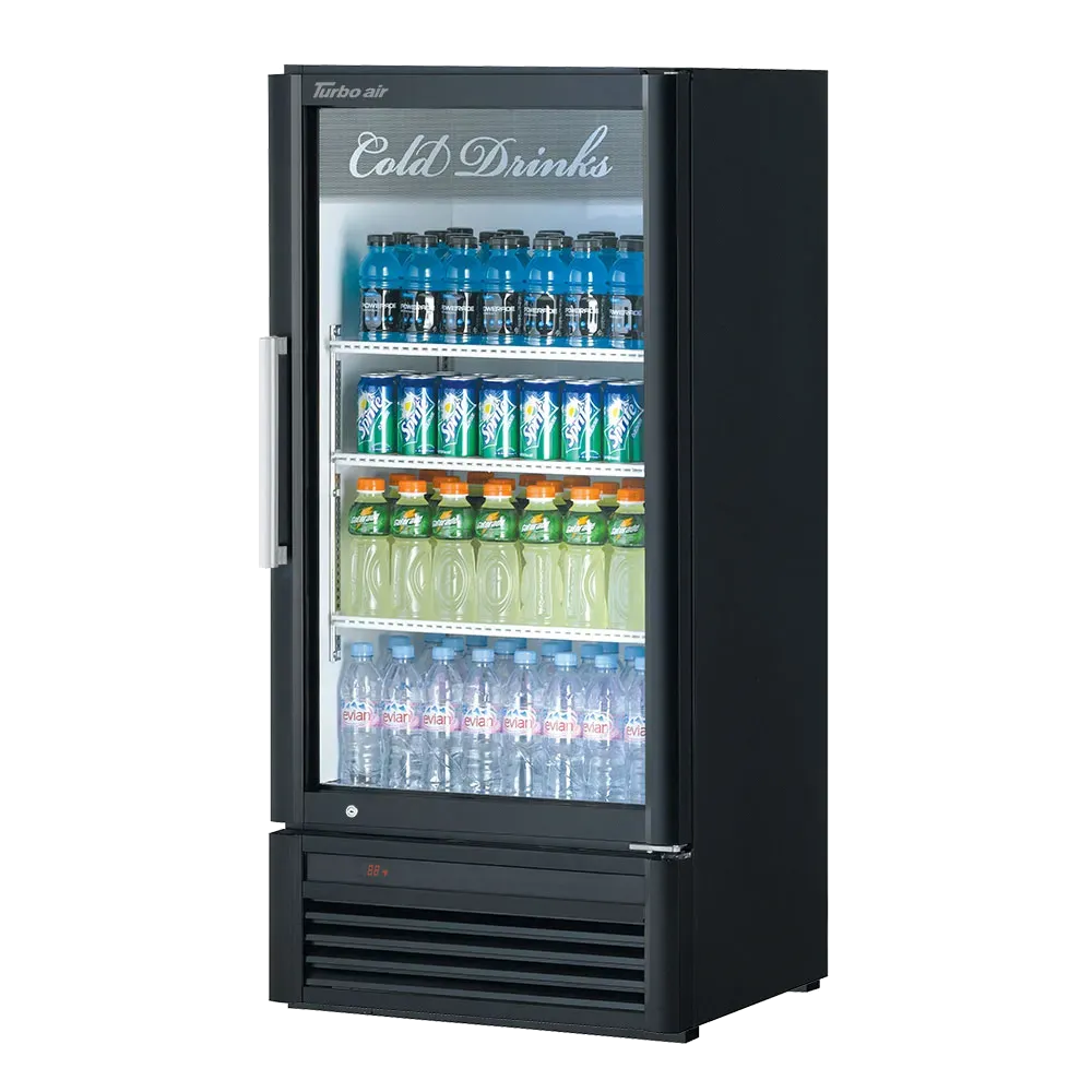 Unleash gastronomic brilliance with the Turbo Air TGM-10SD-N6 Refrigerator Merchandiser. This Super Deluxe refrigerated merchandiser is perfect for commercial restaurant use, offering a spacious one-section design with 8.12 cu. ft. of storage capacity. The self-contained unit features a self-cleaning condenser device, ensuring optimal performance and reducing maintenance needs. The double pane Low-E hinged glass door is not only visually appealing but also equipped with a lock for added security. Inside, you'll find three adjustable PE coated wire shelves, providing flexibility for organizing and displaying your products. The door-activated standard sound system and LED interior lighting create an inviting atmosphere for customers. With a digital thermometer control, door opening alarm, and self-diagnostic monitoring system, you can easily monitor and maintain the perfect temperature for your perishable items. The Turbo Air TGM-10SD-N6 Refrigerator Merchandiser also features an automatic fan motor delay and Turbo cooling function, ensuring efficient operation and preserving the freshness of your products. With its sleek design and reliable performance, this merchandiser is a must-have for any commercial restaurant.