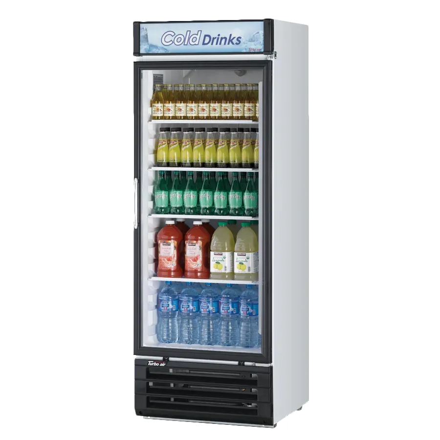 Cook with confidence and flair with the Turbo Air TGM-22RV-N6 Refrigerator Merchandiser. This one-section refrigerated merchandiser is perfect for commercial restaurant use, offering a spacious 20.3 cu. ft. capacity to store and display your products. The double pane Low-E hinged glass door not only provides a clear view of your merchandise but also helps to conserve energy. With LED interior and canopy lighting, your products will be beautifully illuminated, attracting customers' attention. The hot gas condensate system ensures efficient operation and prevents water accumulation, while the four adjustable PE coated wire shelves allow for flexible storage options. The white cabinet with a black door frame adds a sleek and modern touch to your establishment. With a bottom mount compressor and R600a Hydrocarbon refrigerant, this merchandiser is not only energy-efficient but also environmentally friendly. Trust Turbo Air for reliable and high-quality refrigeration solutions for your commercial restaurant needs.