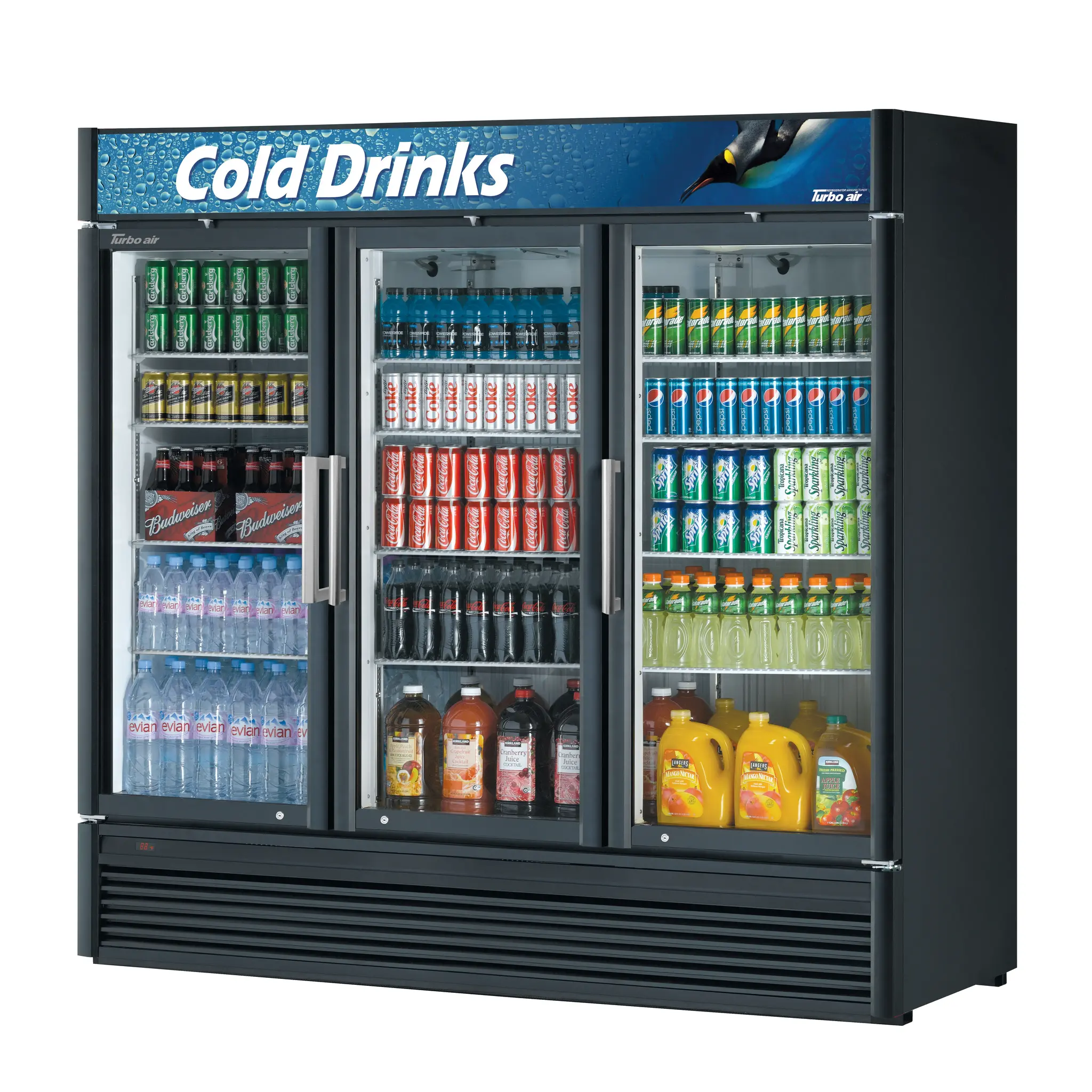 Master the art of flavor with the Turbo Air TGM-72SD-N Refrigerator Merchandiser. This super deluxe glass merchandiser is perfect for commercial restaurant use, offering a spacious three-section design with a capacity of 67.98 cu. ft. The self-contained unit features a self-cleaning condenser device, ensuring optimal performance and reducing maintenance needs. The three double pane Low-E glass doors provide excellent visibility and showcase your products in an attractive manner. With 12 adjustable PE coated wire shelves, you can easily organize and display a wide variety of items. The exterior digital thermometer and controller allow for precise temperature control, while the door opening alarm ensures food safety. The self-diagnostic monitoring system and automatic fan motor delays provide peace of mind, detecting malfunctions and offering early warnings. The Turbo Air TGM-72SD-N also features a hot gas condensate system, Turbo cooling, and a sound system for efficient and quiet operation. The LED interior lighting and LED LGP advertising panel create an eye-catching display, while the white interior and customizable exterior cabinet color add a touch of elegance to your establishment. With its ENERGY STAR certification and use of R290 Hydrocarbon refrigerant, this refrigerator merchandiser is not only efficient but also environmentally friendly. Trust Turbo Air to deliver exceptional quality and performance for your commercial restaurant needs.