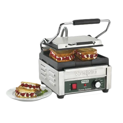 Streamline your restaurant cooking operations with the Waring WFG150 Sandwich/Panini Grill. This compact toasting grill is perfect for commercial use, offering a 9-1/4" x 9-3/4" cooking surface that can handle a variety of sandwiches and paninis. The hinged auto-balancing top plate with heat resistant handles ensures even cooking and easy operation. The flat cast iron plates provide excellent heat distribution and retention, while the adjustable thermostats allow you to achieve the perfect temperature up to 570 F (300 C). With indicator lights and a brushed stainless steel body, this grill is not only functional but also visually appealing. The removable drip tray makes cleaning a breeze, and the UL and NSF certifications guarantee its safety and quality. Upgrade your restaurant kitchen with the Waring WFG150 Sandwich/Panini Grill and enjoy efficient and delicious cooking every time.