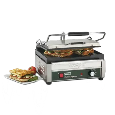 Elevate your culinary experience with the Waring WFG250 Sandwich/Panini Grill. This electric grill is perfect for commercial restaurant use, offering a large 14-1/2" x 11" cooking surface to accommodate multiple sandwiches or paninis at once. The hinged auto-balancing top plate with heat resistant handles ensures even cooking and easy operation. The flat cast iron plates provide excellent heat distribution and retention, resulting in perfectly grilled sandwiches every time. With adjustable thermostats reaching up to 570 F (300 C), you have full control over the cooking temperature to achieve the desired level of crispiness. The indicator lights let you know when the grill is ready for use, and the brushed stainless steel body and removable drip tray make cleaning a breeze. Trust the Waring WFG250 Sandwich/Panini Grill to deliver consistent, high-quality results for your commercial kitchen.