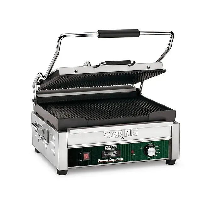 Invest in superior quality with the Waring WPG250TB Sandwich/Panini Grill. This electric grill is designed for commercial restaurant use, offering a large 14-1/2" x 11" cooking surface to handle high-volume orders. The hinged auto-balancing top plate with heat resistant handles ensures even cooking and easy operation. The ribbed cast iron plates create beautiful grill marks on sandwiches and paninis, adding a touch of visual appeal to your dishes. With an adjustable thermostat reaching up to 570 F (300 C), you have precise control over the cooking temperature for perfect results every time. The brushed stainless steel body not only looks sleek but also ensures durability and easy cleaning. The removable drip tray catches any excess grease, making maintenance a breeze. Trust the Waring WPG250TB Sandwich/Panini Grill to elevate your restaurant's sandwich game and impress your customers with delicious, perfectly grilled creations.